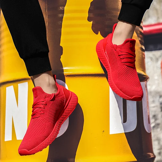Fly Weave Spring Autumn Men Sport Shoes All Red Air Mesh Breathable Lace Up Running Shoes Athletic Jogging Walking Men Sneakers
